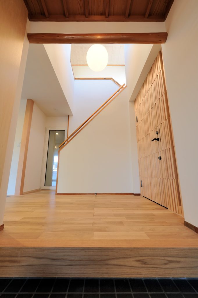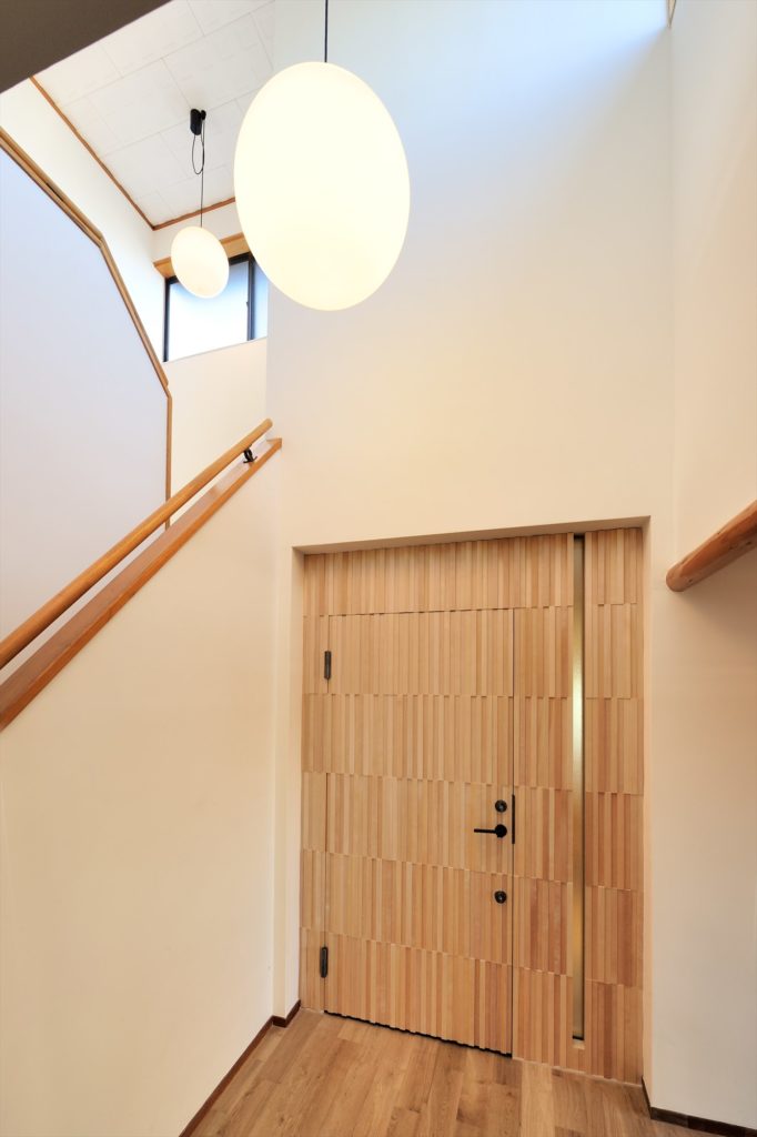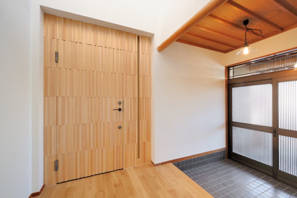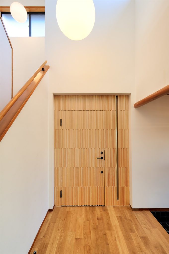 玄関を入ってすぐのリビングの扉は木製の玄関戸を加工したオリジナルの作品です。建具屋さんが3日かけて作りました。