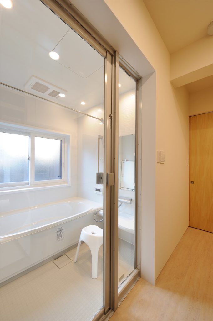 白を基調とした浴室です。透明ガラスで区切っているので通常の1坪タイプの浴室より広く感じます。中にいる人の安否も確認できます。
