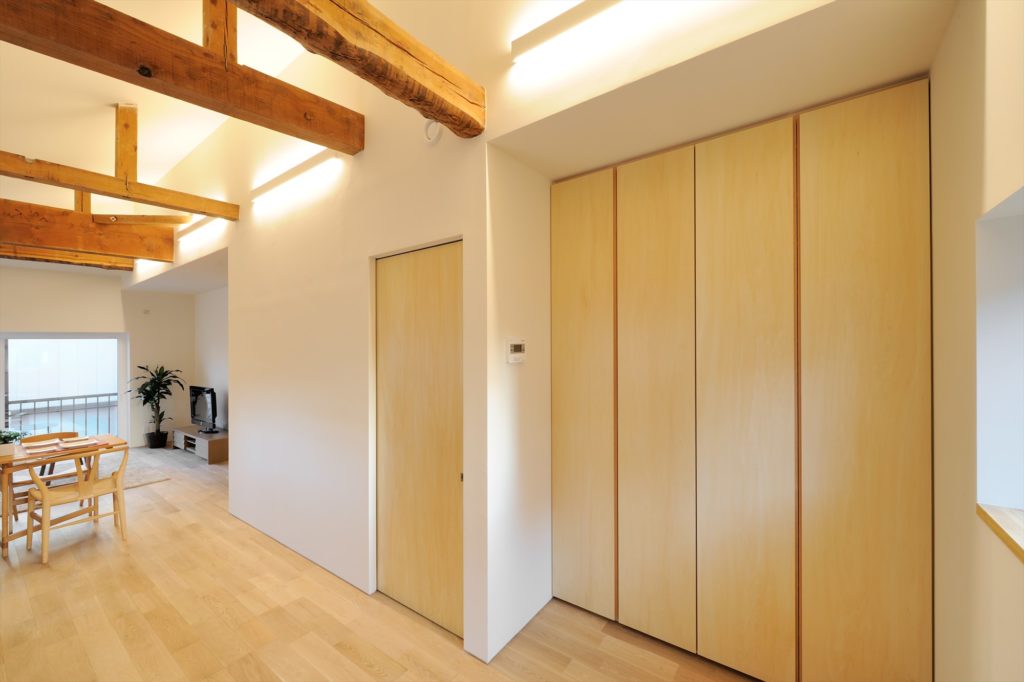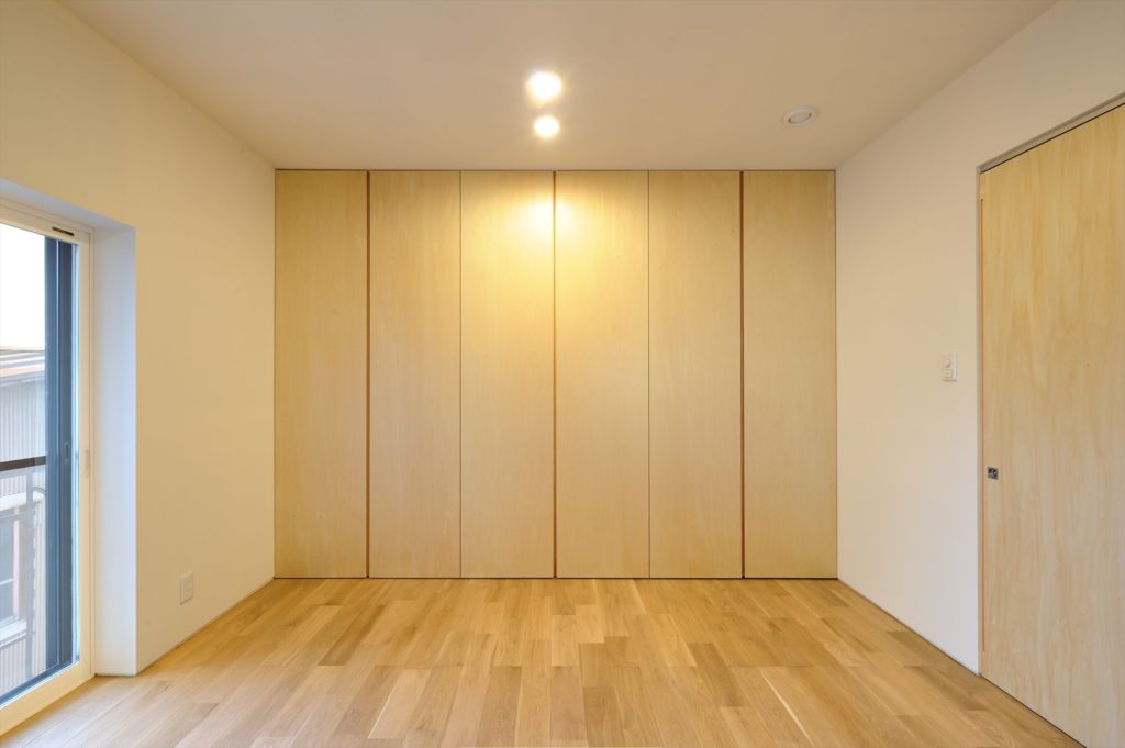 寝室です。収納もたっぷり。収納の扉も建具屋さんがオリジナルで作ったものです。リビングの扉以外は同じテーマで扉を作成しています。