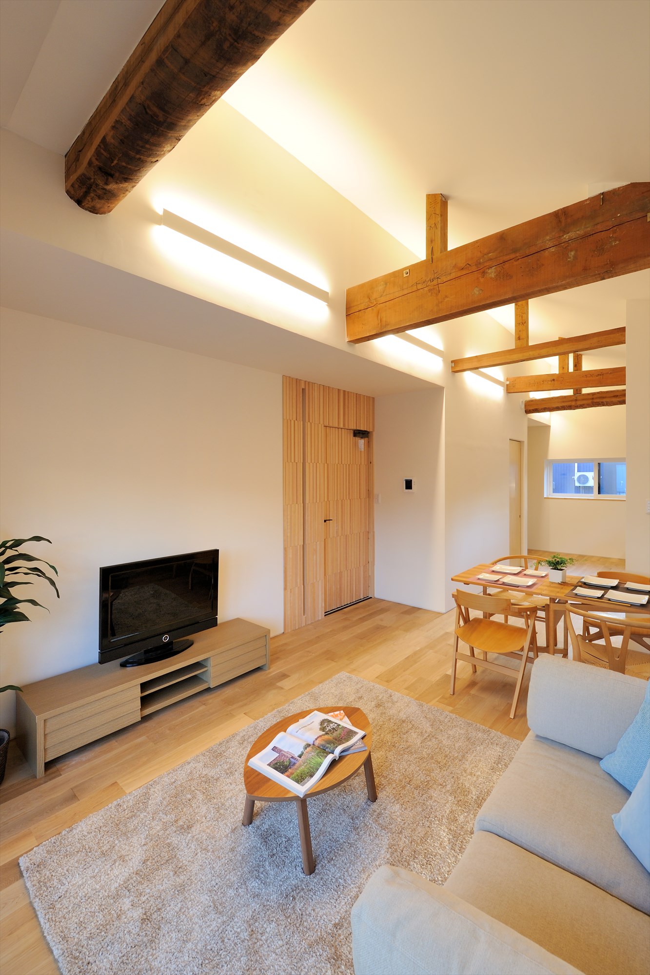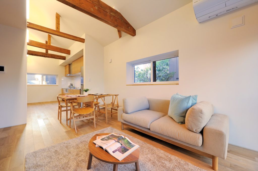 リビングです。ベースに淡い色みを使い、梁や家具で木のぬくもりをアクセントとして使っています。