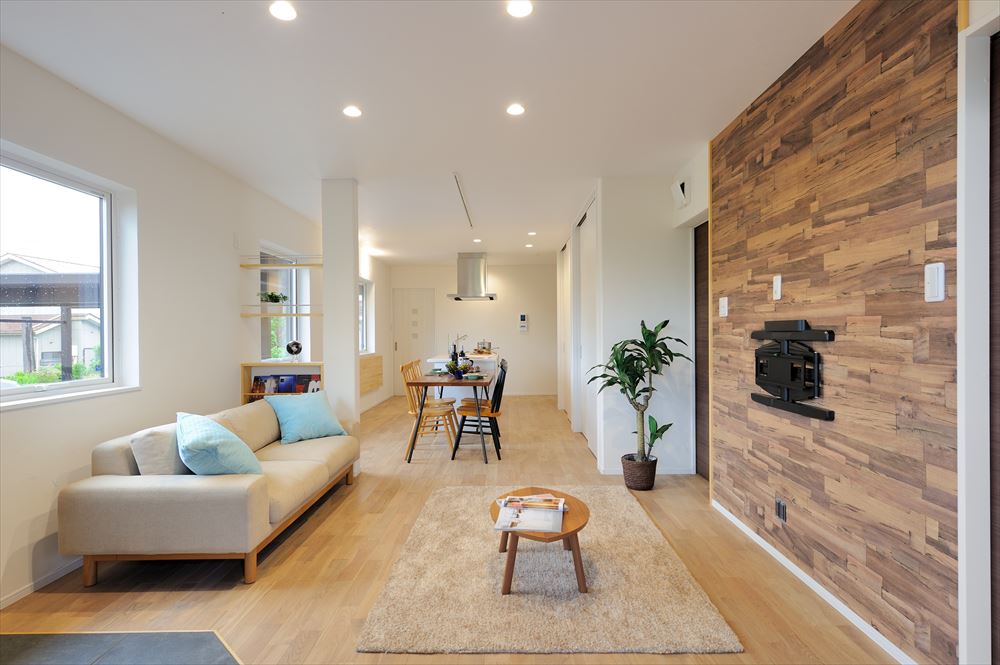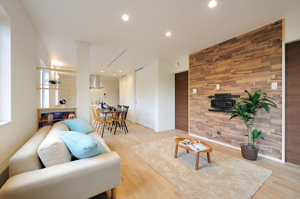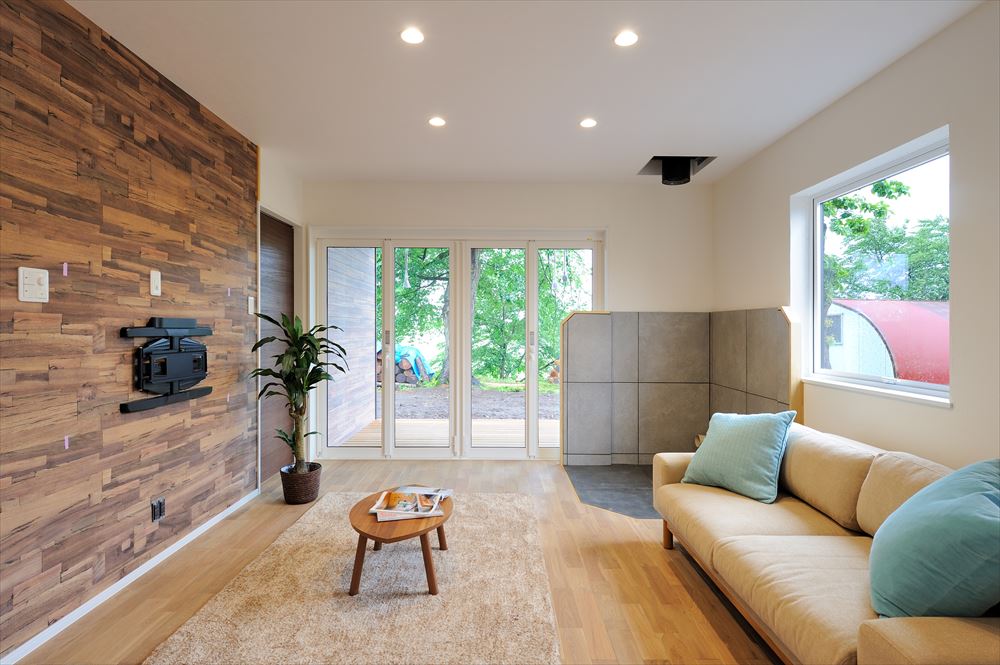 ソファーと向かいのボードには壁掛けテレビを取り付けます。最近よく出てる家庭用シアターを置いても楽しいですね。