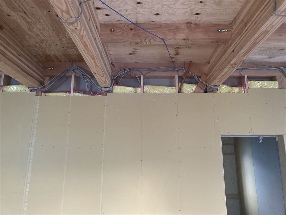 壁の上に見える断熱材がファイアストップです。これで壁天井裏への延焼を防ぎます。省令準耐火工事の一つです。省令準耐火工事はもちろん費用が掛かりますが、火災保険費が全然違います。将来的にはお得となるのでやらない手はありませんね。
