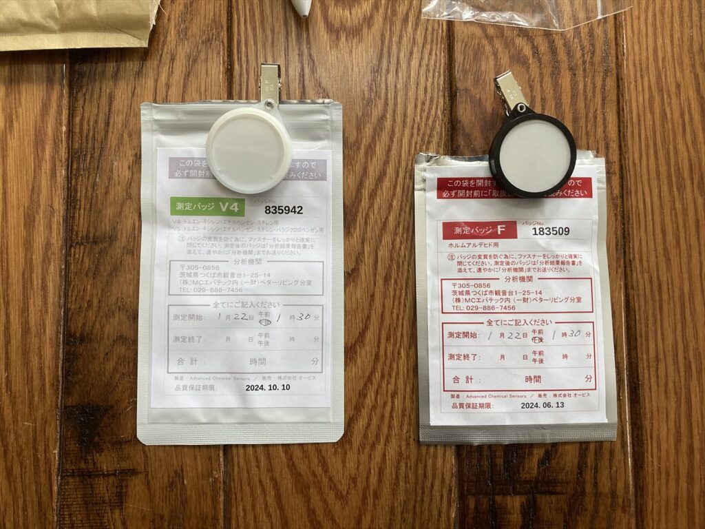 昨日二つの計測バッチを現場に置き24時間放置します。空気に含まれている物質が計測バッチに吸着されます。これを調査会社に送り分析してもらいます。