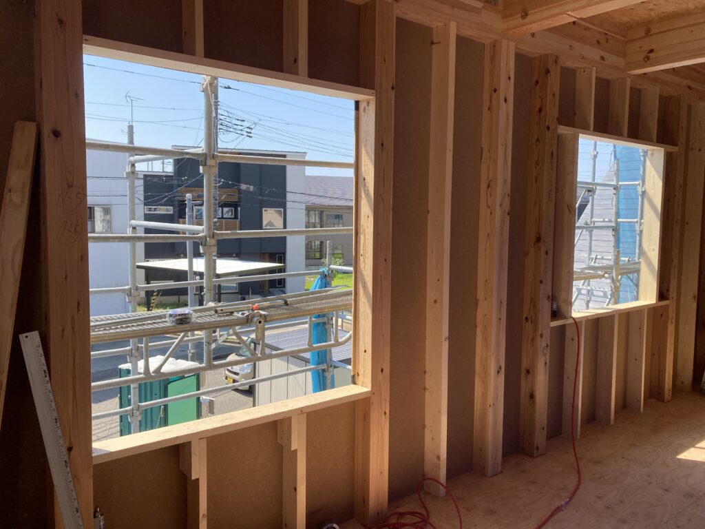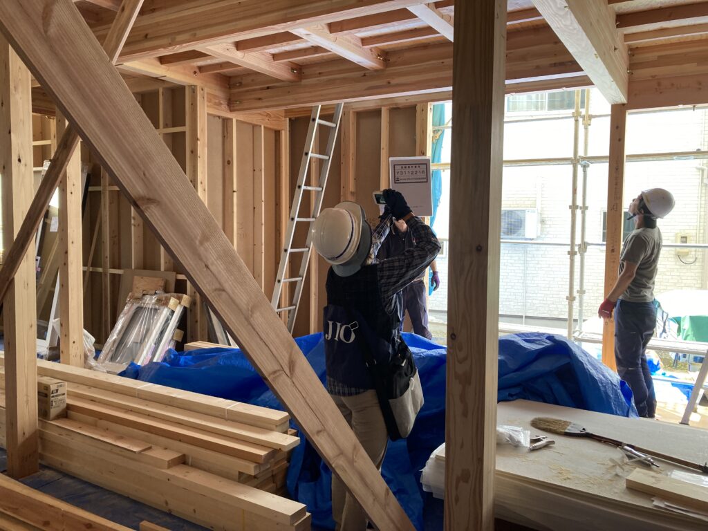 屋根の下です。水平構面を取るために小屋梁の上に合板が貼られています。