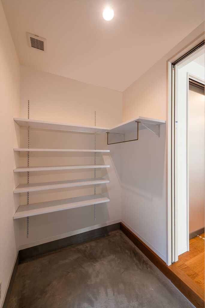 奥のシューズクローゼットは自在棚なので、棚の間隔を自由に伸縮できるのと、後で棚を増設する事も可能です。