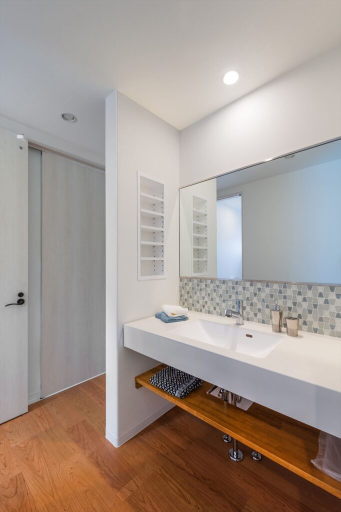 今回はホワイトを使いました。こちらに造作で棚を付けました。タイルとミラーの組み合わせがとても綺麗ですね。