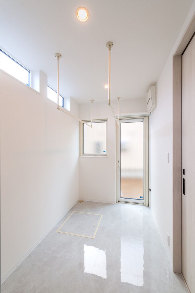 ③ランドリールームです。洗うから干すが一ヵ所で完結します。このお部屋の隣がウォーク・イン・クローゼットになっており、干した後ハンガーをつけたまましまってお終いです。ハンガーはトーソー株式会社製のハンギングバーです。