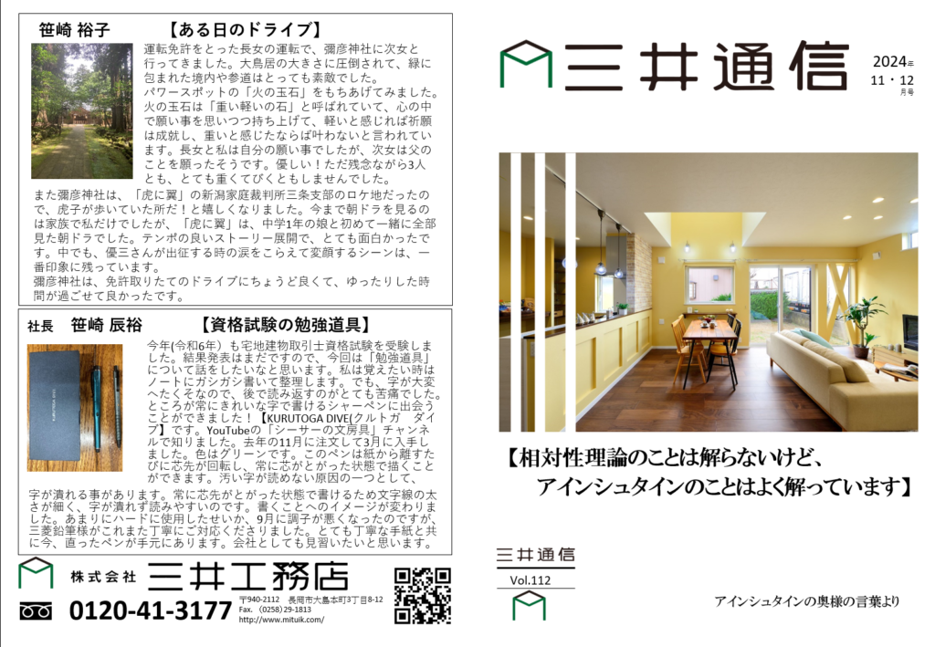 長岡市 耐震等級3 三井工務店 です。 【三井通信11・12月号】ができました。1年ぶりです。 その間は会長が【ありがとう通信】を作成配布しておりました。 ありがとう通信が好きな方、今回三井通信にも記事を寄稿してくださいました。 弊社でお世話になったお客様のお手元には今月、来月お手元にカレンダーと一緒に届きます。 ちょっと字が小さいので、今回このブログでもアップすることにしました。 スマホでもお読みいただけますが、PCディスプレイならさらに大きく見られます。楽しんでいただけたら何よりです。