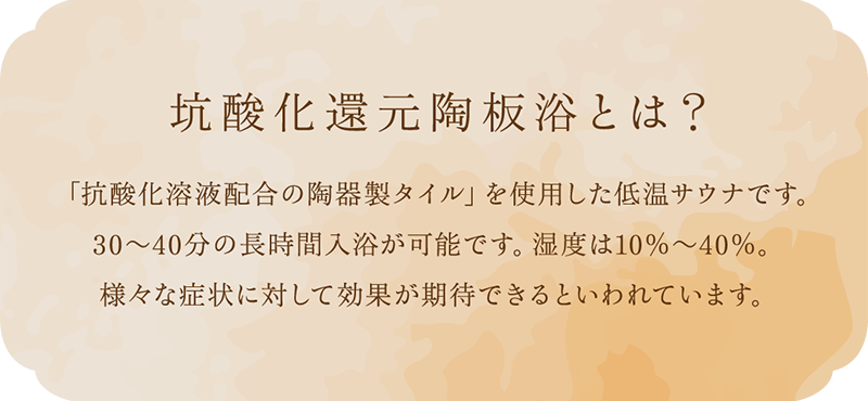| 施設内容 | 温浴室8人床(室温41℃~45℃/湿度LOW~45%) 更衣室、シャワー、トイレ、待合室 |