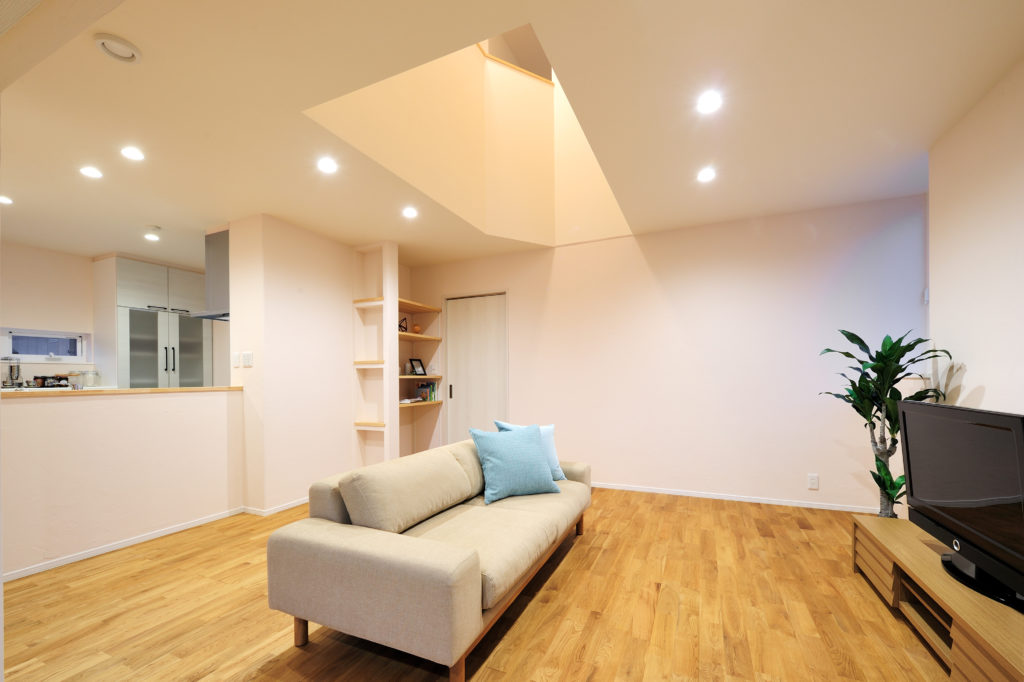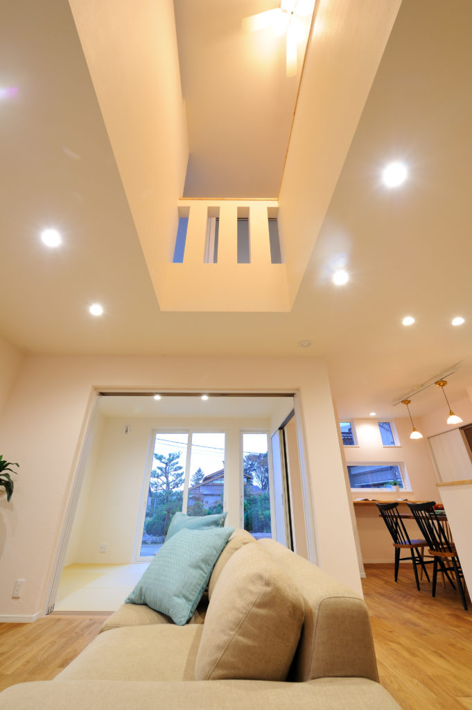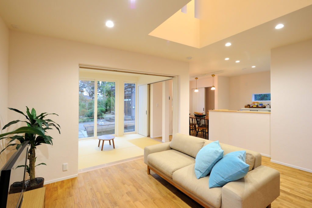 吹き抜けからの間接光、和室の大きな窓からの自然光で明るいLDKになりました。リビングと和室と吹き抜け。リビングが中央に来るために吹き抜けを設け光を入れました。ちょうどよい量で光が差し込み、居心地がよく美しいです。和室とリビングと台所を可能な限り開放的にしました。