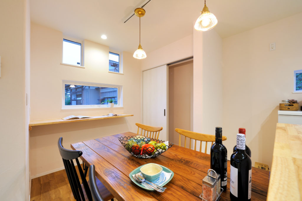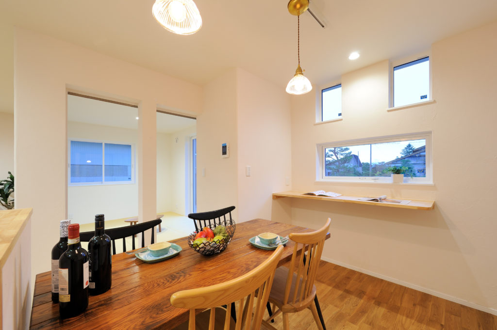 高い位置の二つの窓を光取りに、目線の高さの横長の窓で景色を楽しめるダイニングです。