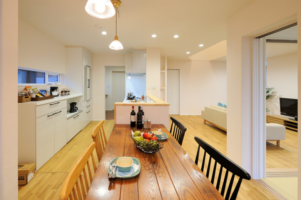 テーブルの奥がキッチンです。横並びですので配膳が楽ですね。