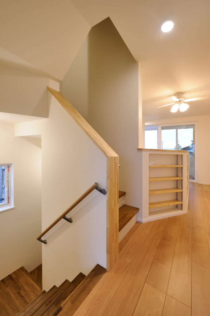 2階への階段とロフトへの階段です。手すり壁の作り付けの棚には本がたくさん収納できます。