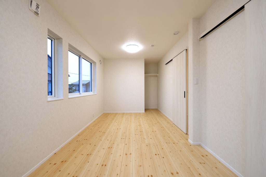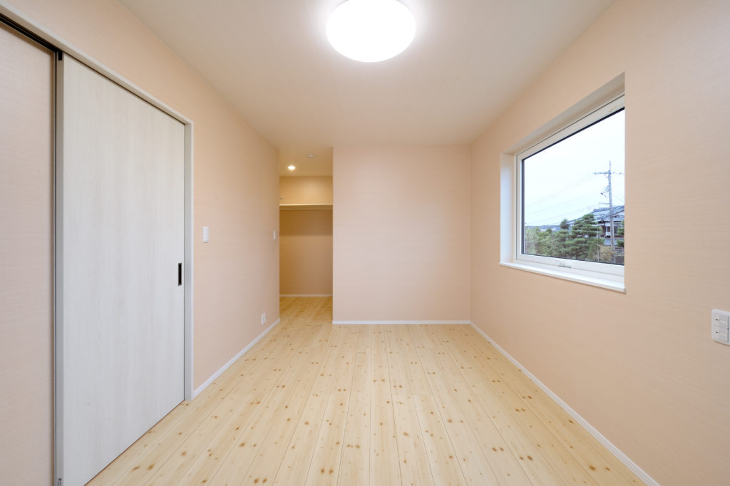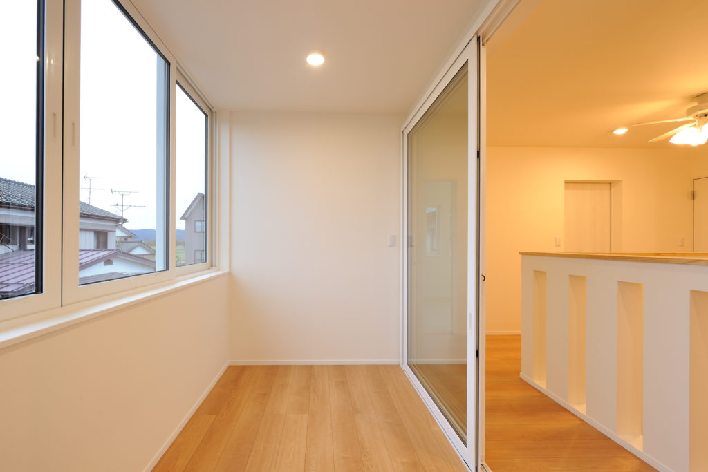 子供室です。建具の間の出っ張りはスイッチをつけるために出しました。将来、二間に仕切れます。