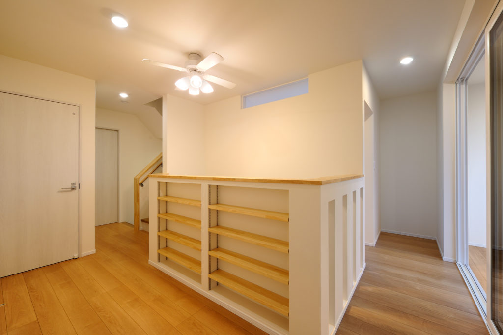 吹き抜けを中心に廊下を回廊のように作りました。吹き抜け手すりの本棚は自在棚で棚位置を変えることができます。