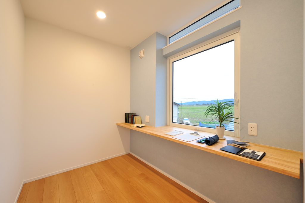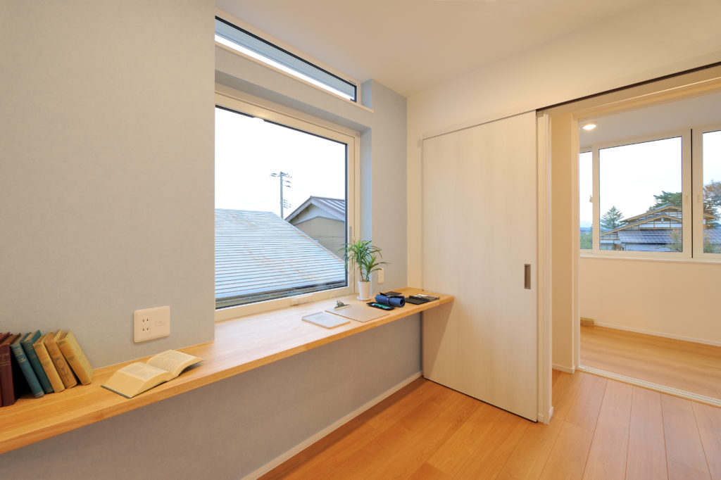 お子さんがここで勉強するのもよいですね。。ワークスペース、洗面洗濯室までが直線でつながっている。動きやすさを重視しました。