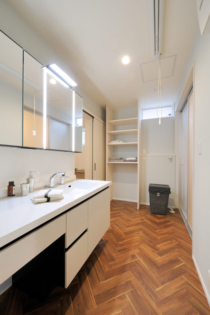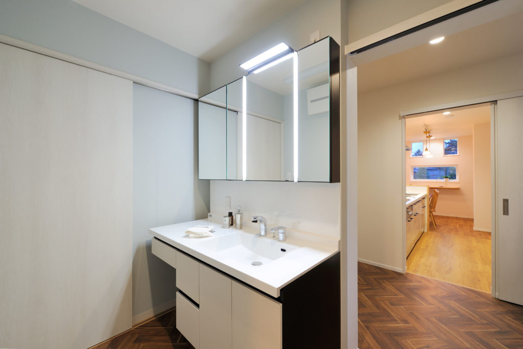 洗面洗濯室です。朝のラッシュタイム緩和には横長のミラーはとても便利。