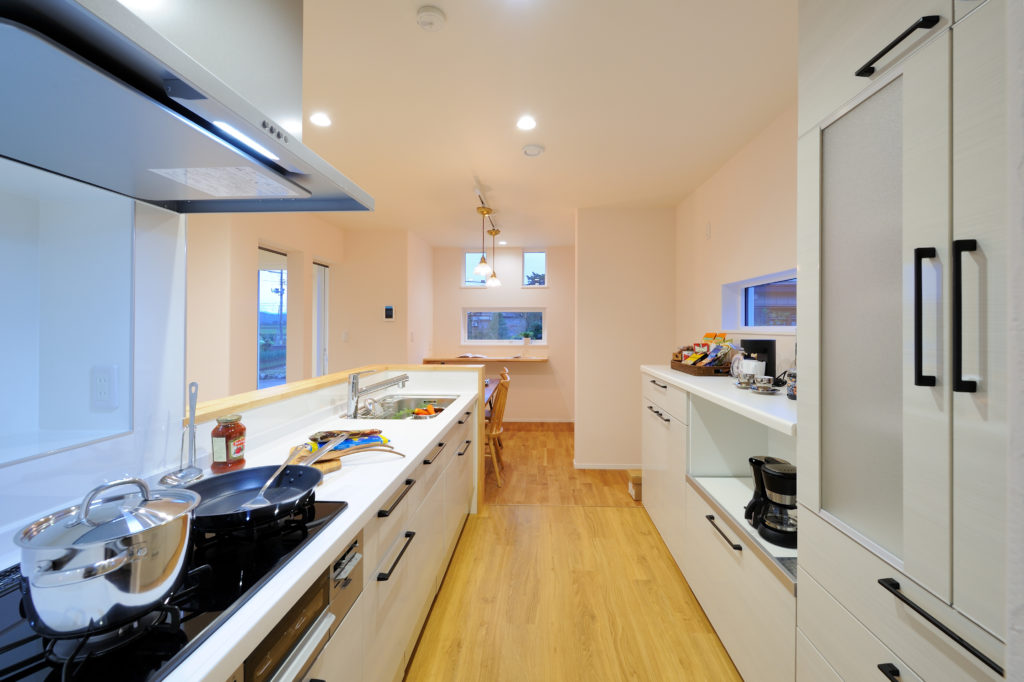 洗面台の奥は奥様用のワークスペース。その奥が台所。一直線につながっていて動きやすいです。
