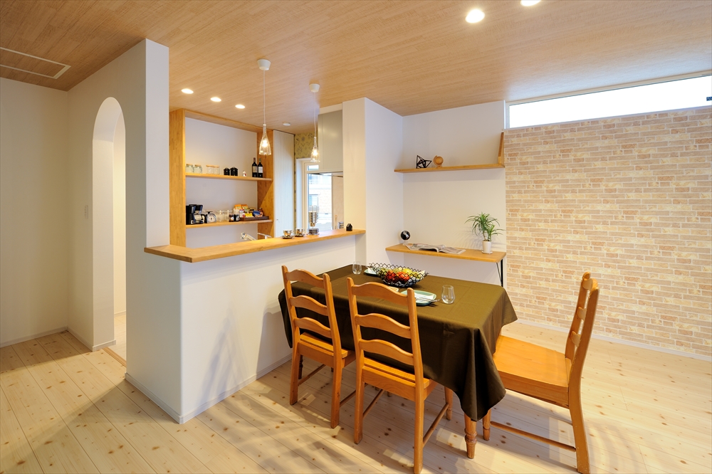 キッチンからダイニングその奥のカウンターをみた感じです。コンロの奥は物が置けるようになっています。熱や汚れにも耐えうるようにキッチンパネルで被覆してあります。キッチンの油汚れが付くことが多いので、お手入れが簡単なマチュア(クッションフロアでも硬めのもの)を使いました。