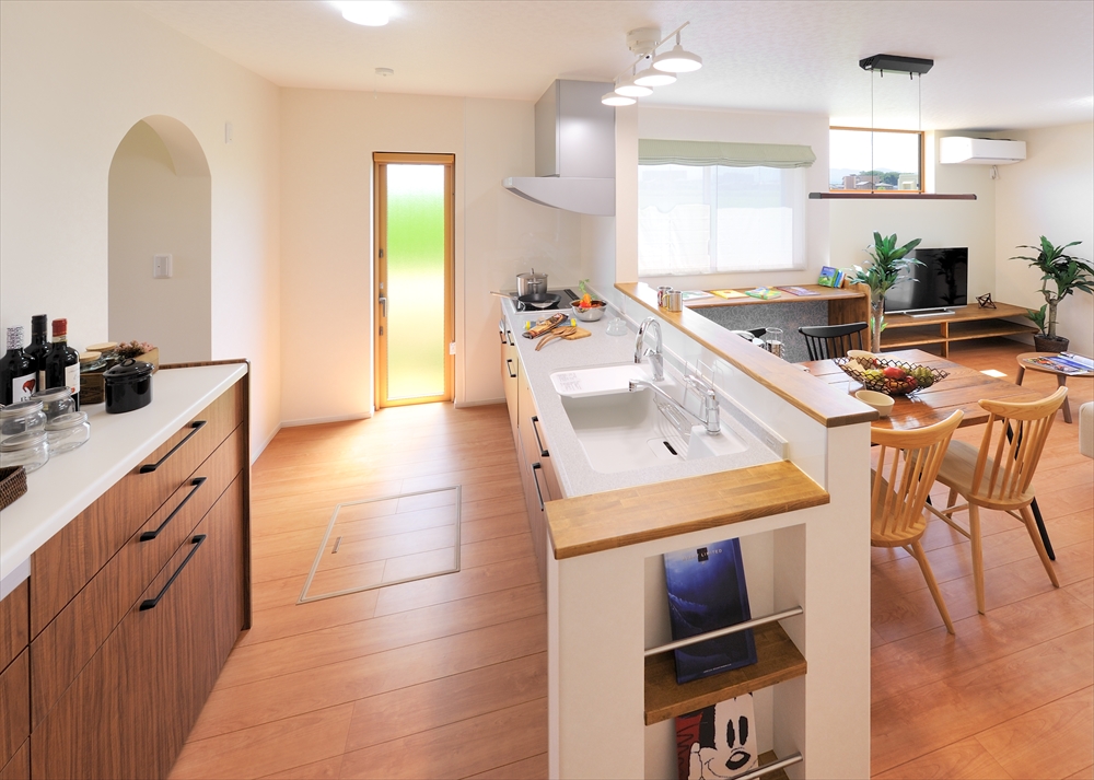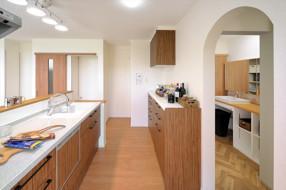 キッチンを別角度で。R壁の奥は奥様のワークスペース→洗面室→洗濯室とつながっています。