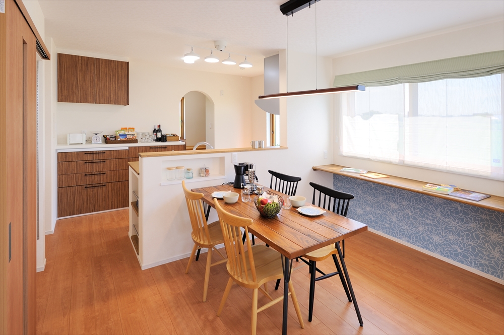 ダイニングです。キッチンとダイニングを区切る腰壁に、調味料入れがついています。