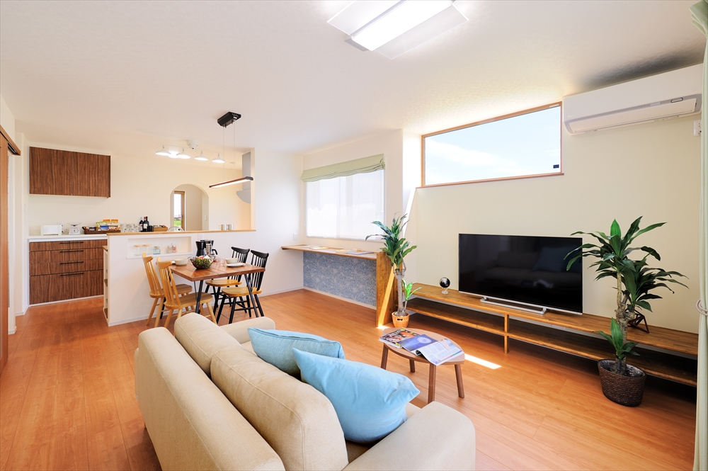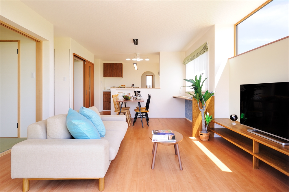 青空がきれいなリビングです。台所から室内を一望できるようになっています。