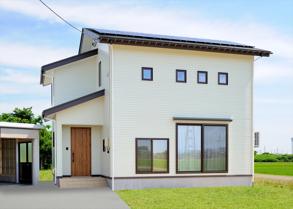 ご家族4人でのご生活を考えたお住まいです。立地を生かし、落雪式屋根や太陽光発電も採用しています。