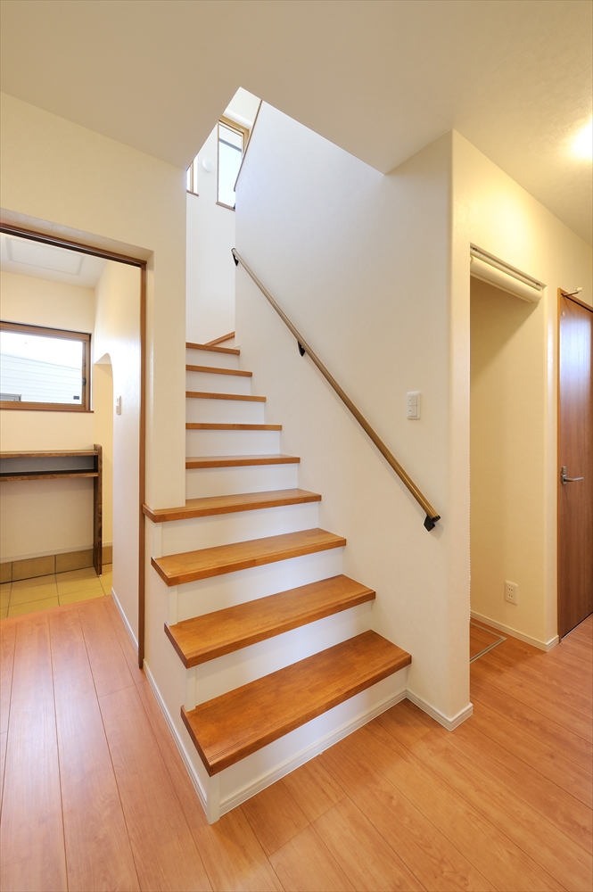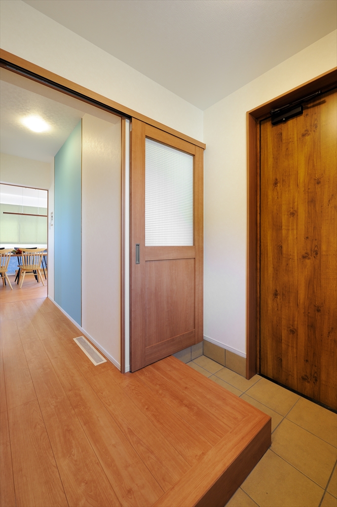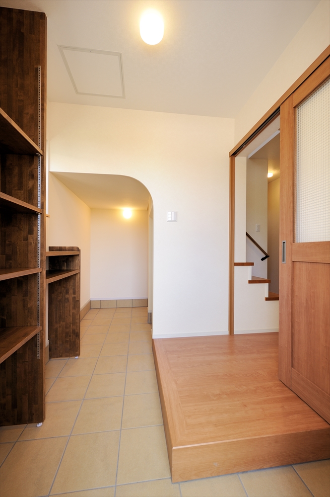 玄関を別角度で。来客が多い時にも靴が置けるように、上がり框をこんな形にしました。