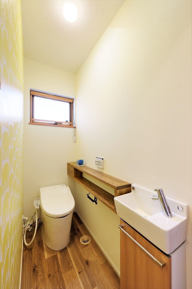 壁のカウンターにはトイレットペーパーがたくさん並べられるようになっています。奥は蓋つきの収納になっています。