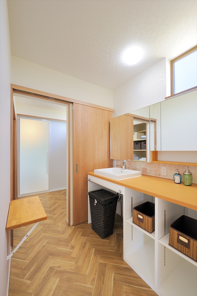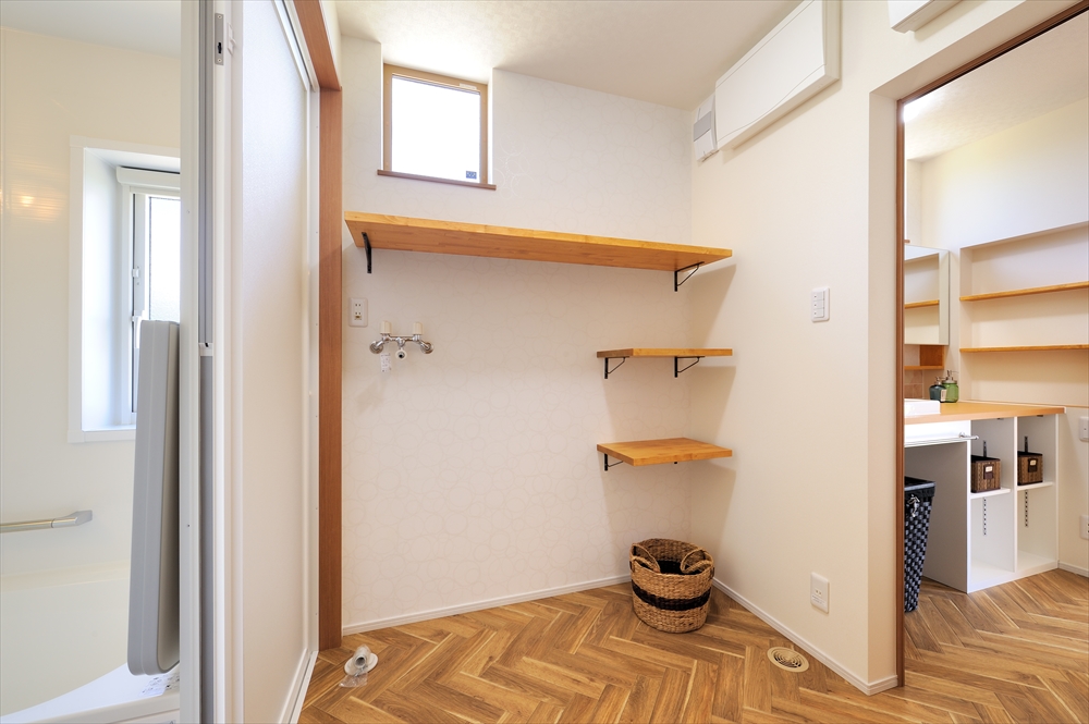 洗濯室です。普段使いのタオルや洗剤が散らからない様に考えました。