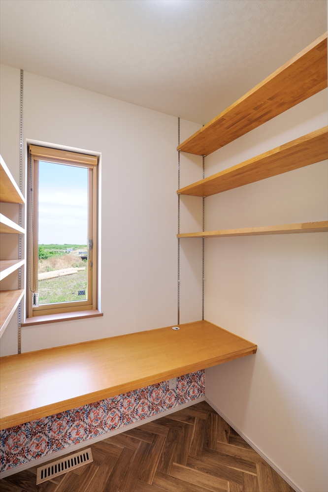 奥様のワークスペースです。自在棚は資料によって高さを変えられるので便利です。