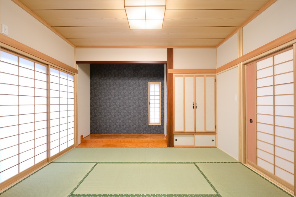 コンセプト通り、全体的にかわいいデザインのお住まいです。ダイニングには小上がりの畳スペースを設けました。ちょっとした作業にも便利なワークスペースも完備しています。収納スペースもたっぷりあり、2階にもご夫婦のワークスペースを設けるなど使い勝手抜群の間取りとなっております。