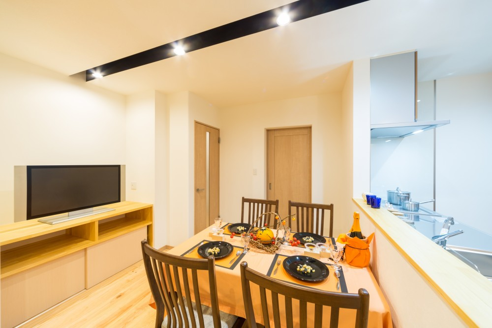 窓は少ないですがライトと白壁で明るい空間になっています。