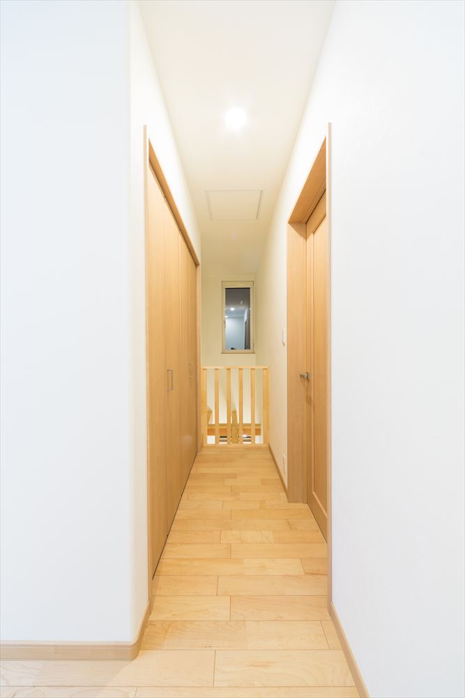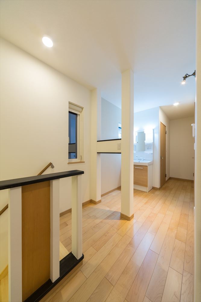 廊下奥に見えるのは吹き抜けの柵です。下からの明かりや閉じられていない空間に開放感があります。