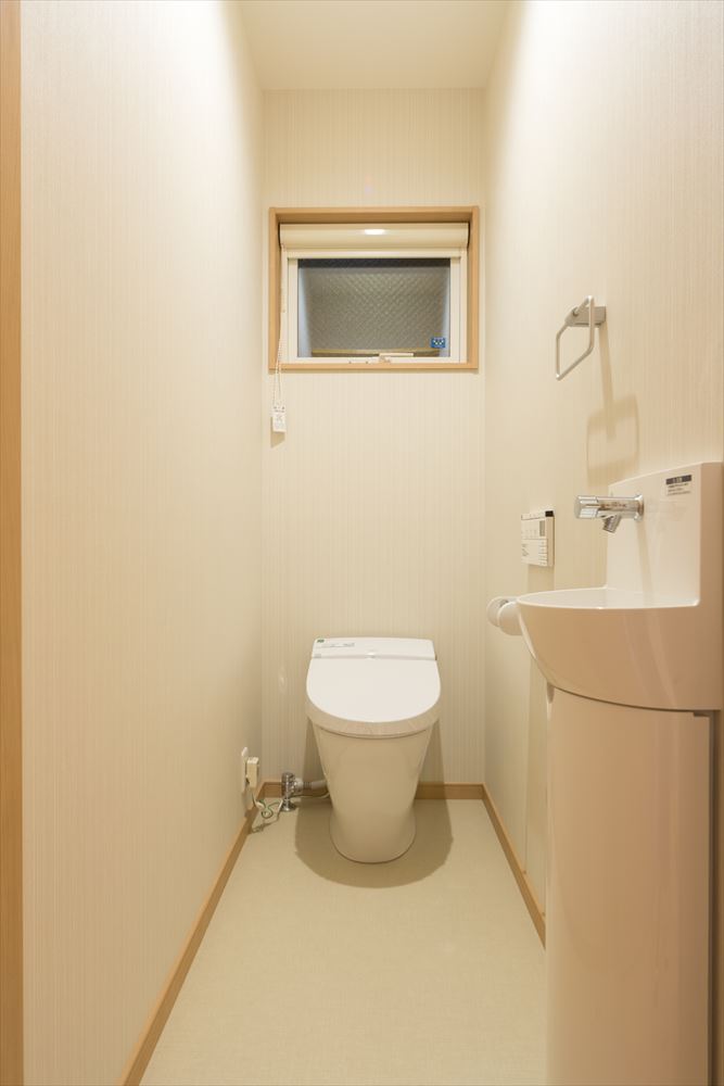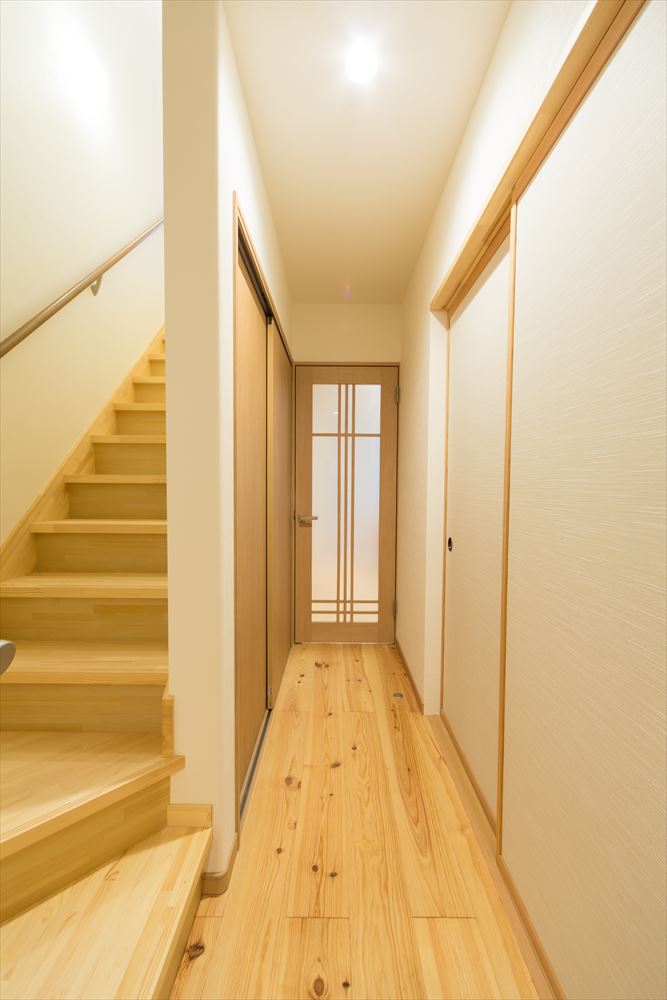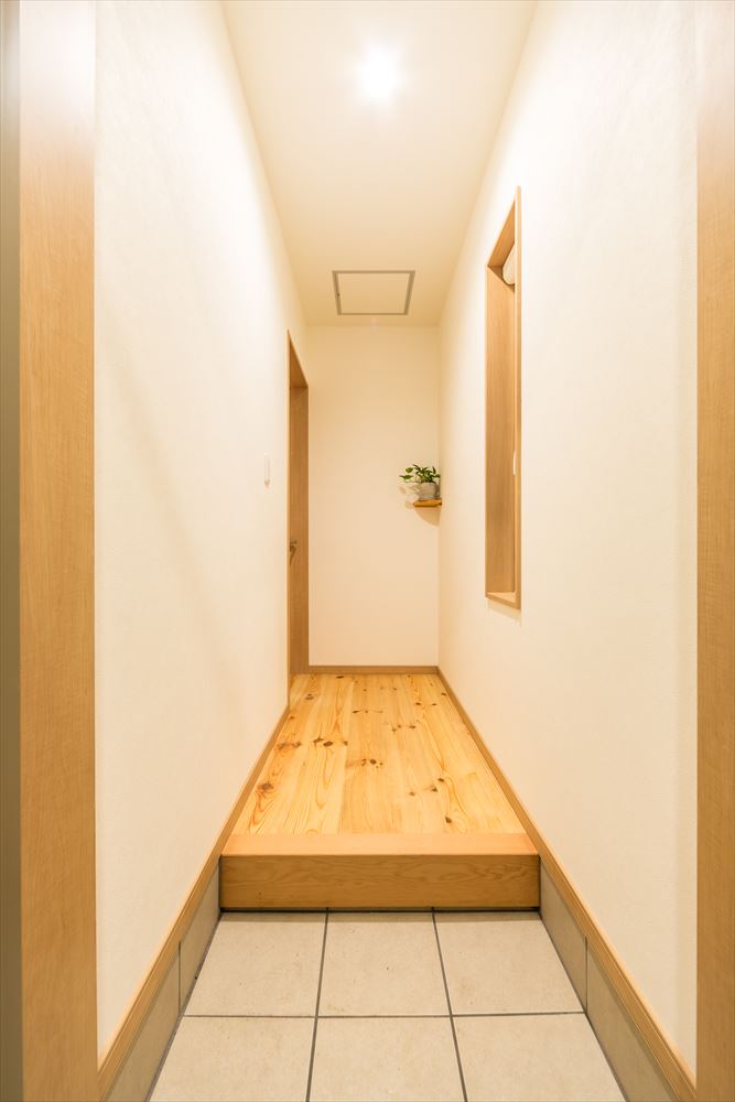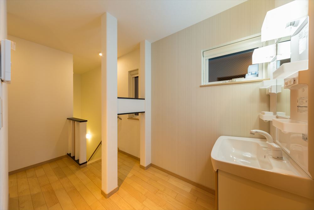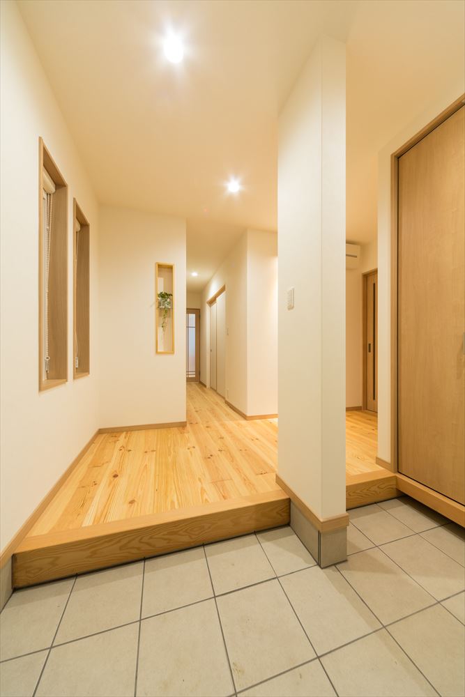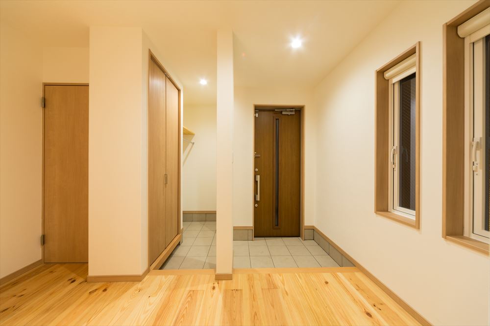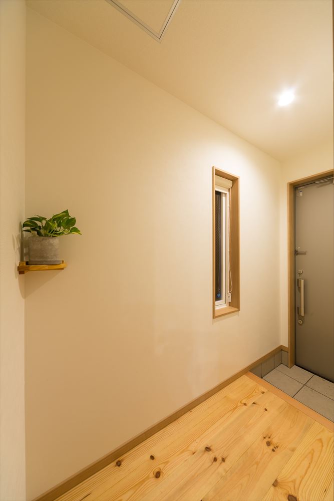 明かり取りの窓を二つ付け、白い壁と木目で統一され、とても明るい玄関フロアとなっています。