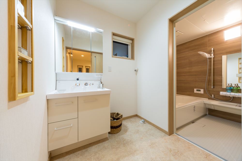 浴室は広く木枠とアクセントパネルが柔らかい印象になっています。