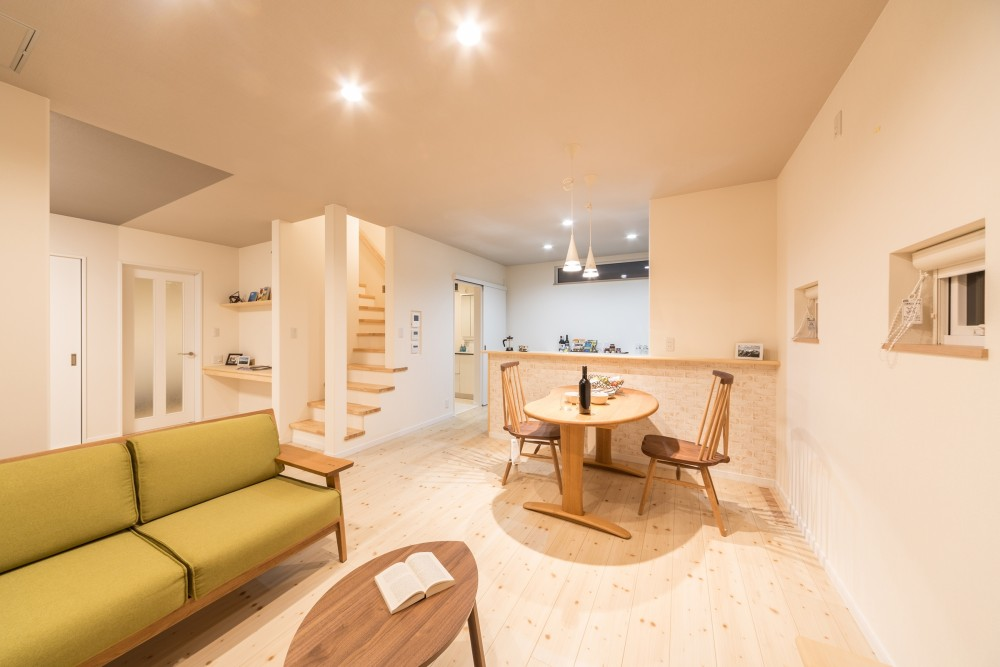1階、2階それぞれのLDKは間取り的、デザイン的にはよく似ているのですが、親世代、子世代どちらもしっかりヒアリングをし、それぞれの希望する生活を収納や飾り棚で形にしました。