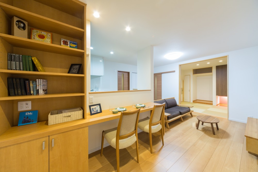 窓側に長いカウンターを設けてリビング周りの収納もしっかりできます。