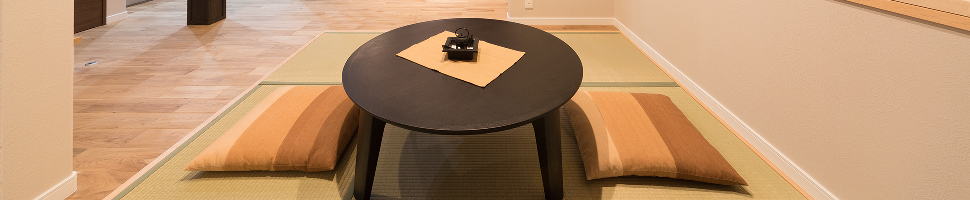 和の雰囲気が特徴的なお住まいです。間取りは奥行きがある形です。一番奥に寝室がありますが、水回りも設け、介護しやすい作りにしました。和室はLDKと繋げ開放的にしました。Rの壁や、古民家風な建具や家具を上手に組み合わせて、落ち着いた雰囲気を作りました。必要なところに設けた収納もとても役に立っています。