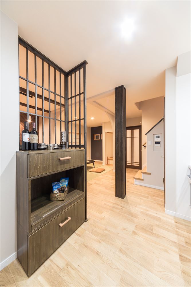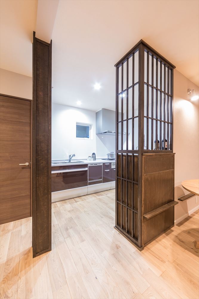 古民家風のキッチンカウンターはこんな感じです。木の格子が室内のアクセントになっています。