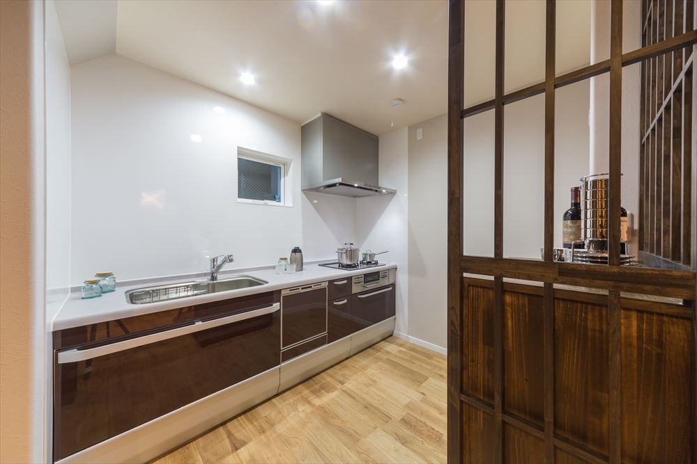 床も木のぬくもりを感じるデザインになっています。 キッチンのカラーも全体の雰囲気に合うものにしました。